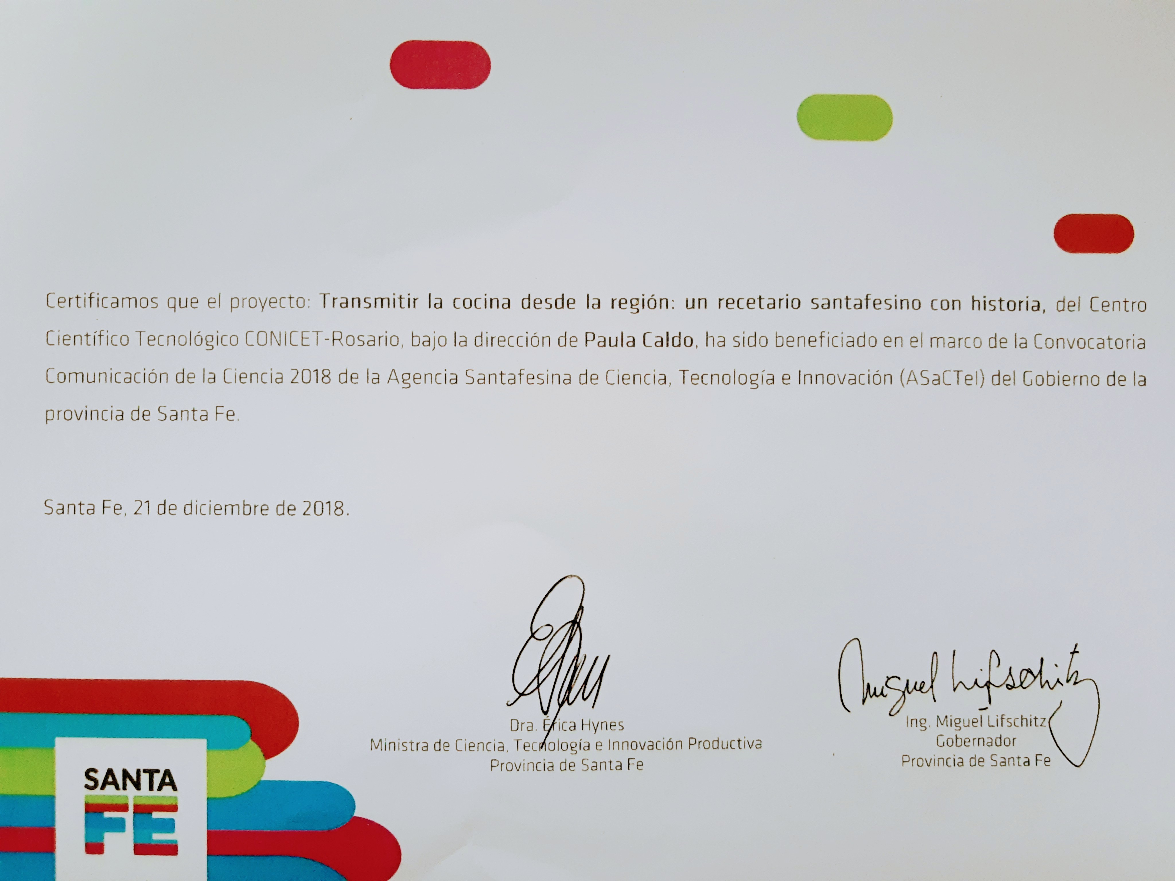Proyecto de CC-042-18 “Transmitir la cocina desde la región. Un recetario santafesino con